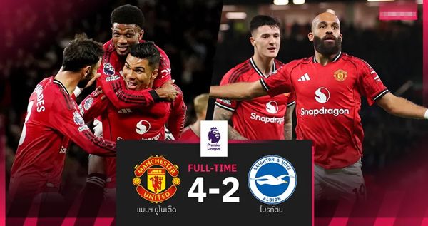 แมนเชสเตอร์ ยูไนเต็ด ฟอร์มร้อนแรงต่อเนื่องเปิดรังเชือด ไบรท์ตัน 4-2 เกมนี้ ไบรอัน เอ็มเบอโม่ เหมาสองพา “ปีศาจแดง” คว้าชัย 3 นัดรวดในพรีเมียร์ลีก เก็บเพิ่มเป็น 16 คะแนน ขยับรั้งอันดับ 4 ชั่วคราวก่อนเกมคู่ดึกที่ ลิเวอร์พูล ลงสนามคืนนี้
