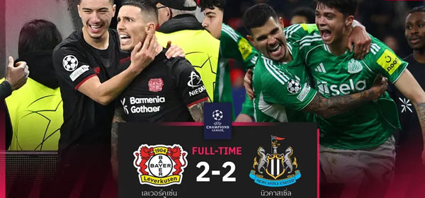 นิวคาสเซิ่ล พลิกจากตามหลังแซงนำ โดยได้ แอนโธนี่ กอร์ดอน ซัดจุดโทษพร้อมแอสซิสต์ ทว่า เลเวอร์คูเซ่น ไม่ถอดใจ อเล็กซ์ กริมัลโด้ หลุดซัดตีคืนนาที 88 จบเสมอ 2-2 "สาลิกาดง" มีเพิ่มเป็น 10 คะแนนอยู่พื้นที่เพลย์ออฟเข้ารอบเช่นเดียวกับ "ห้างยา"